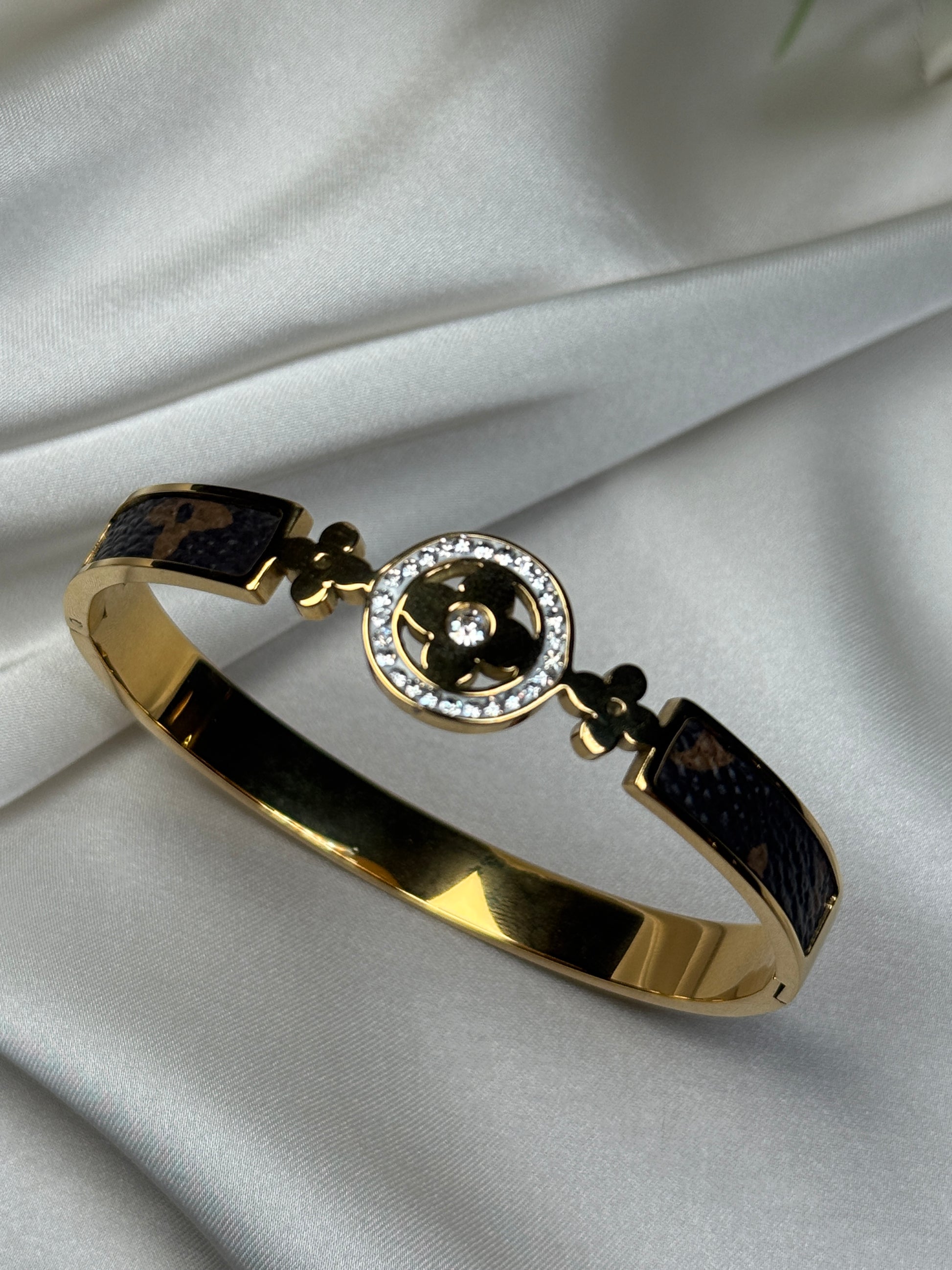 Statement-Armreif aus Edelstahl, 18K vergoldet, mit markantem runden Zierelement in der Mitte. Ein luxuriöses Schmuckstück, das Eleganz und Stärke vereint – perfekt für besondere Anlässe.
