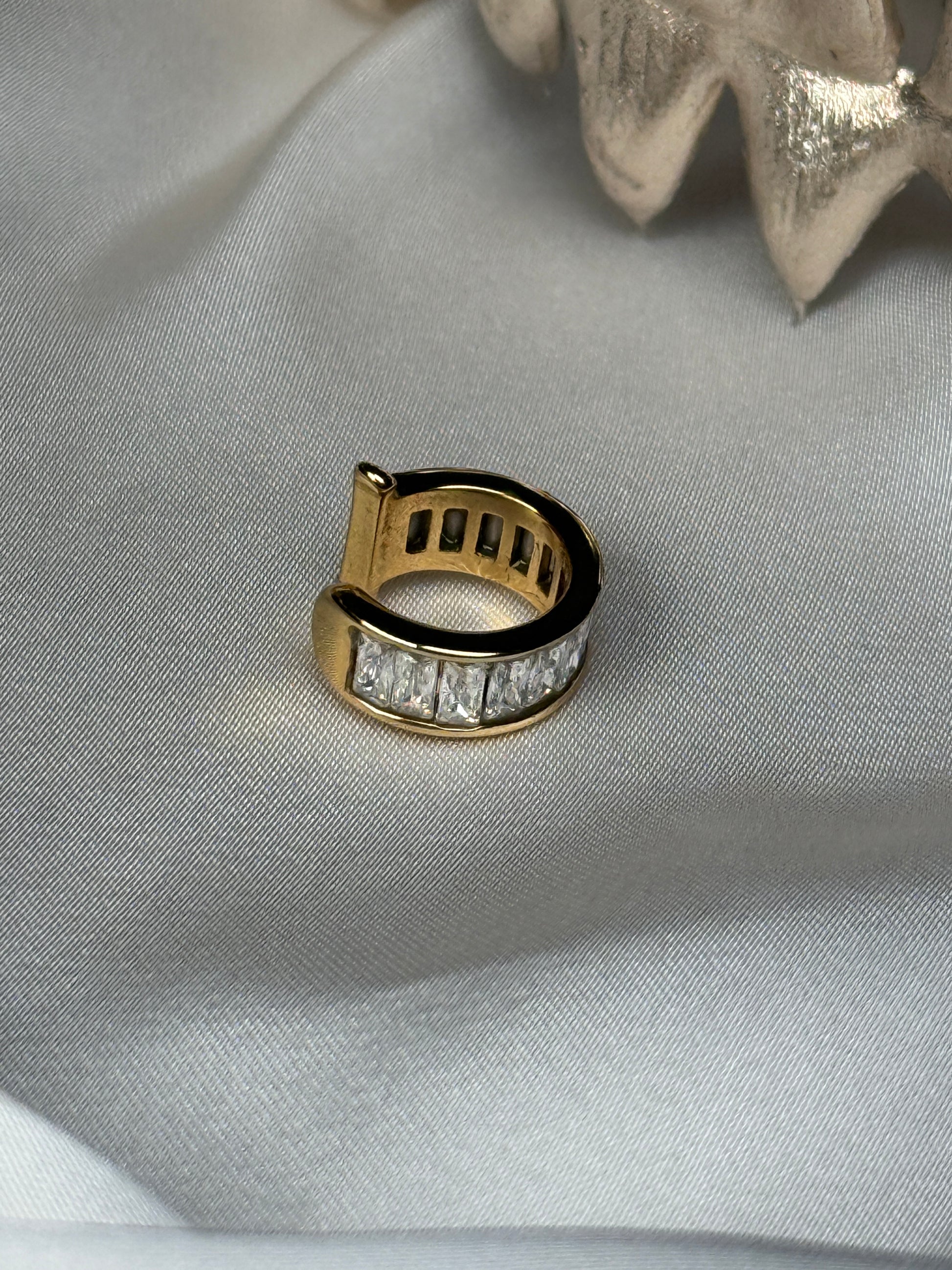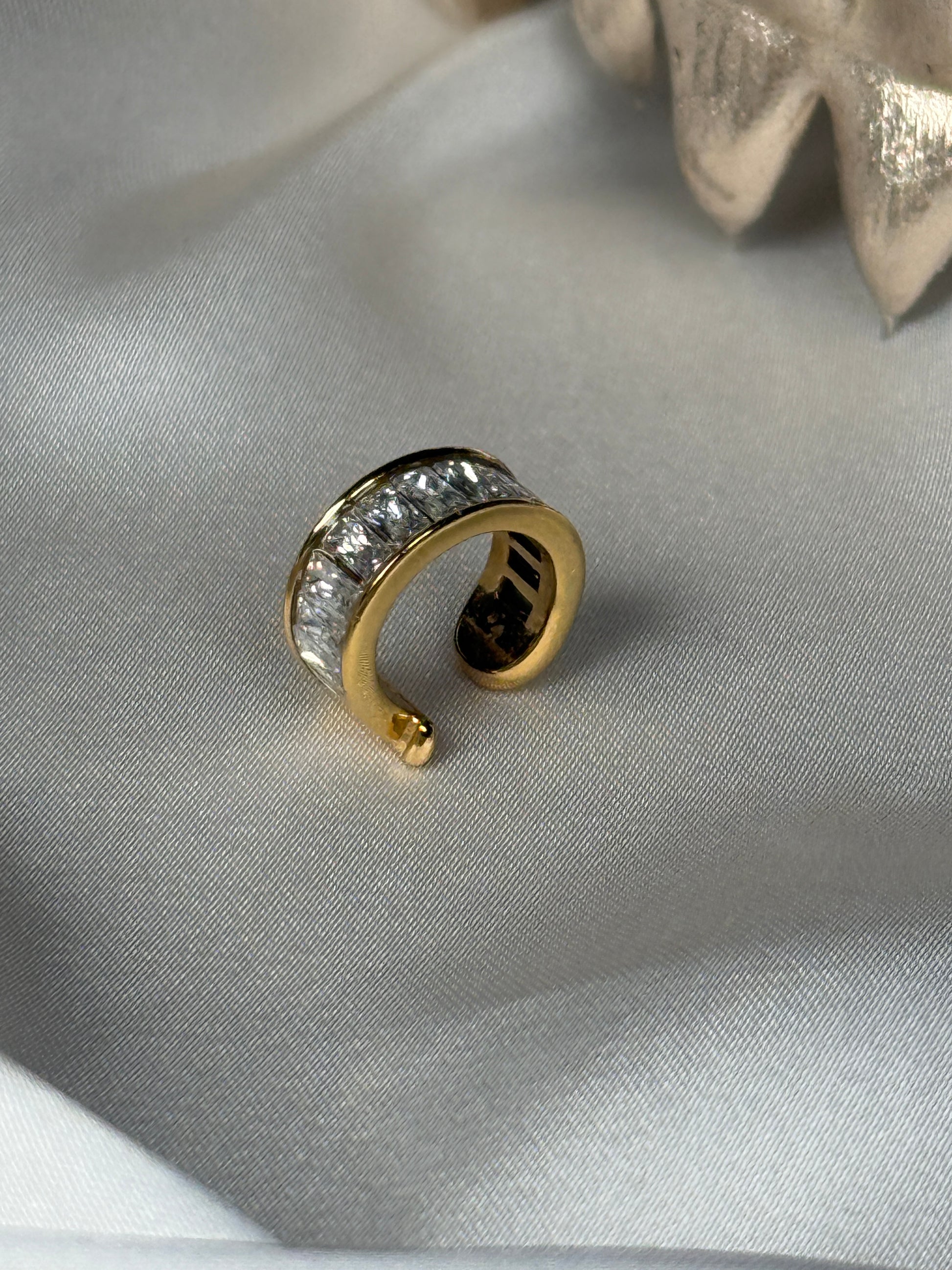 Moderner Ear Cuff aus Edelstahl, 18K vergoldet, besetzt mit klaren Kristallen im funkelnden Design. Lässt sich einfach ohne Ohrloch tragen und verleiht jedem Look ein glänzendes Highlight.