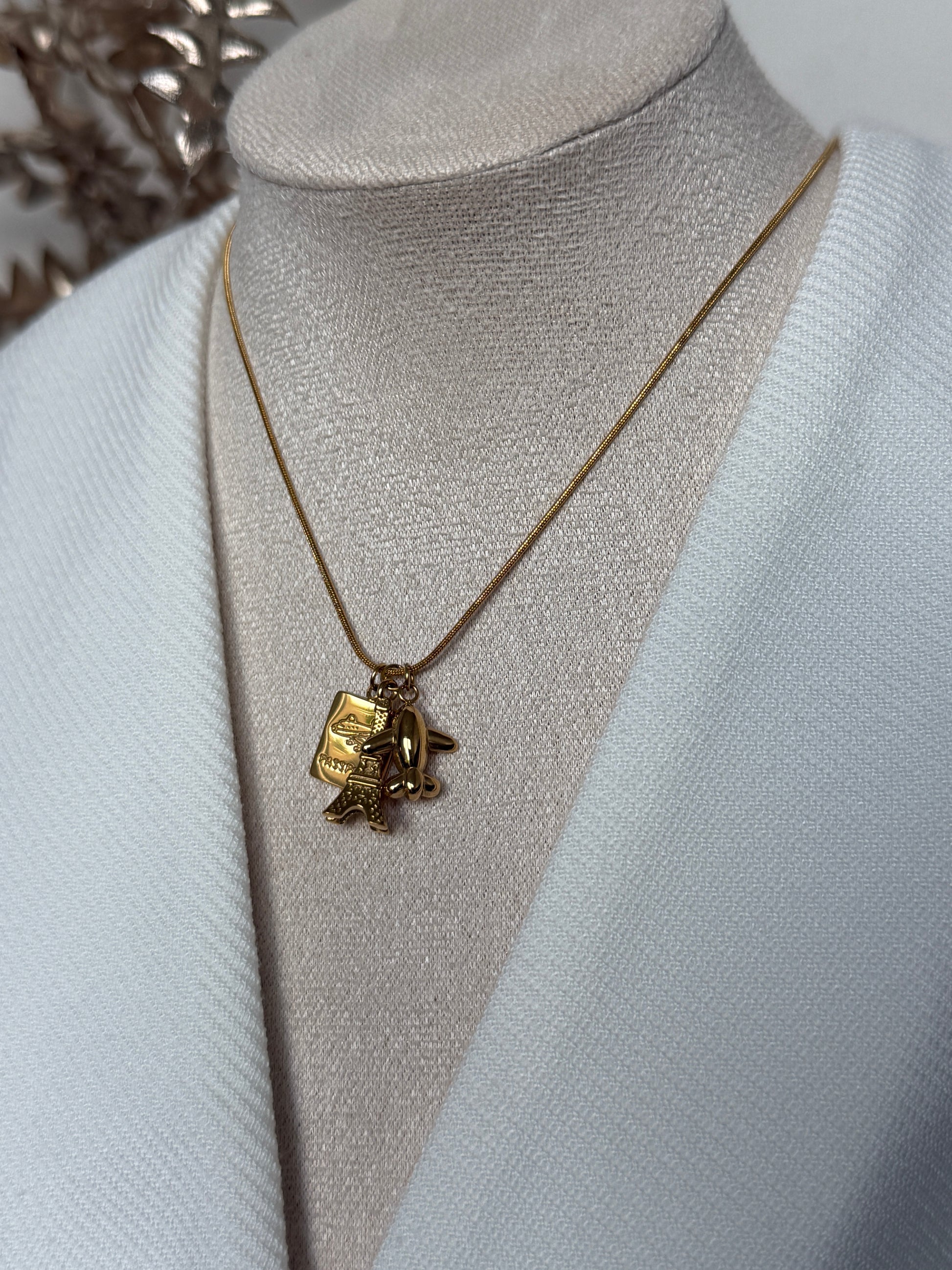 Verspielte Halskette mit kleinen Anhängern – Eiffelturm, Flugzeug und Reisepass. Ein Must-have für alle, die das Fernweh im Herzen tragen und Paris lieben.