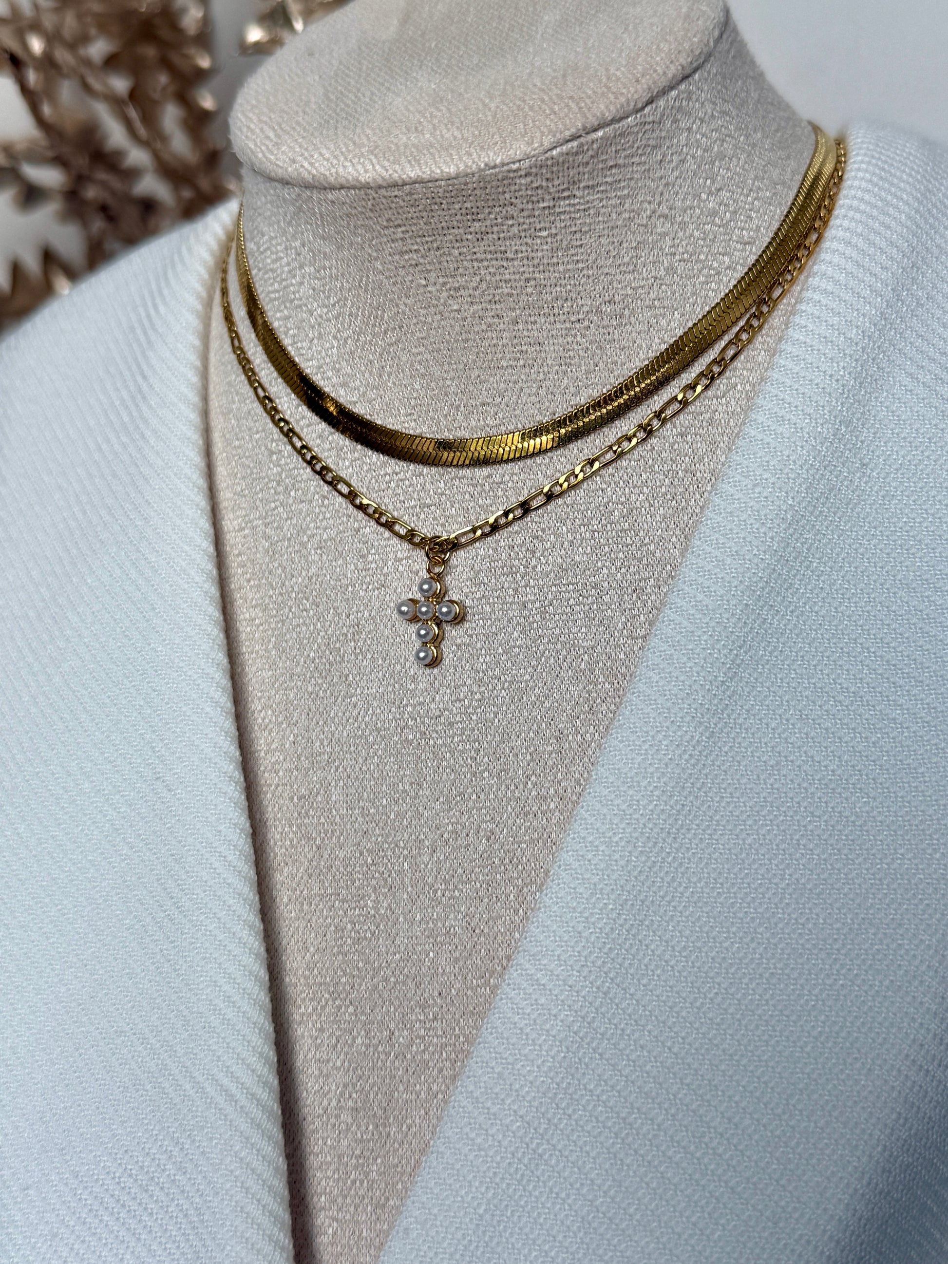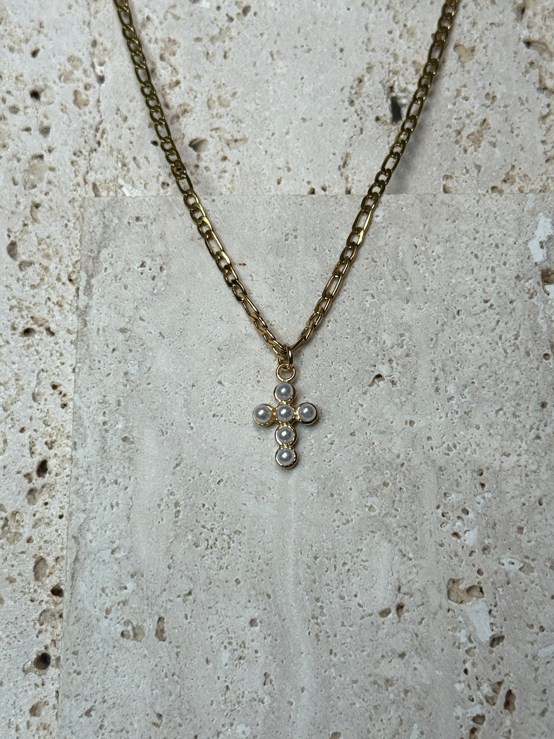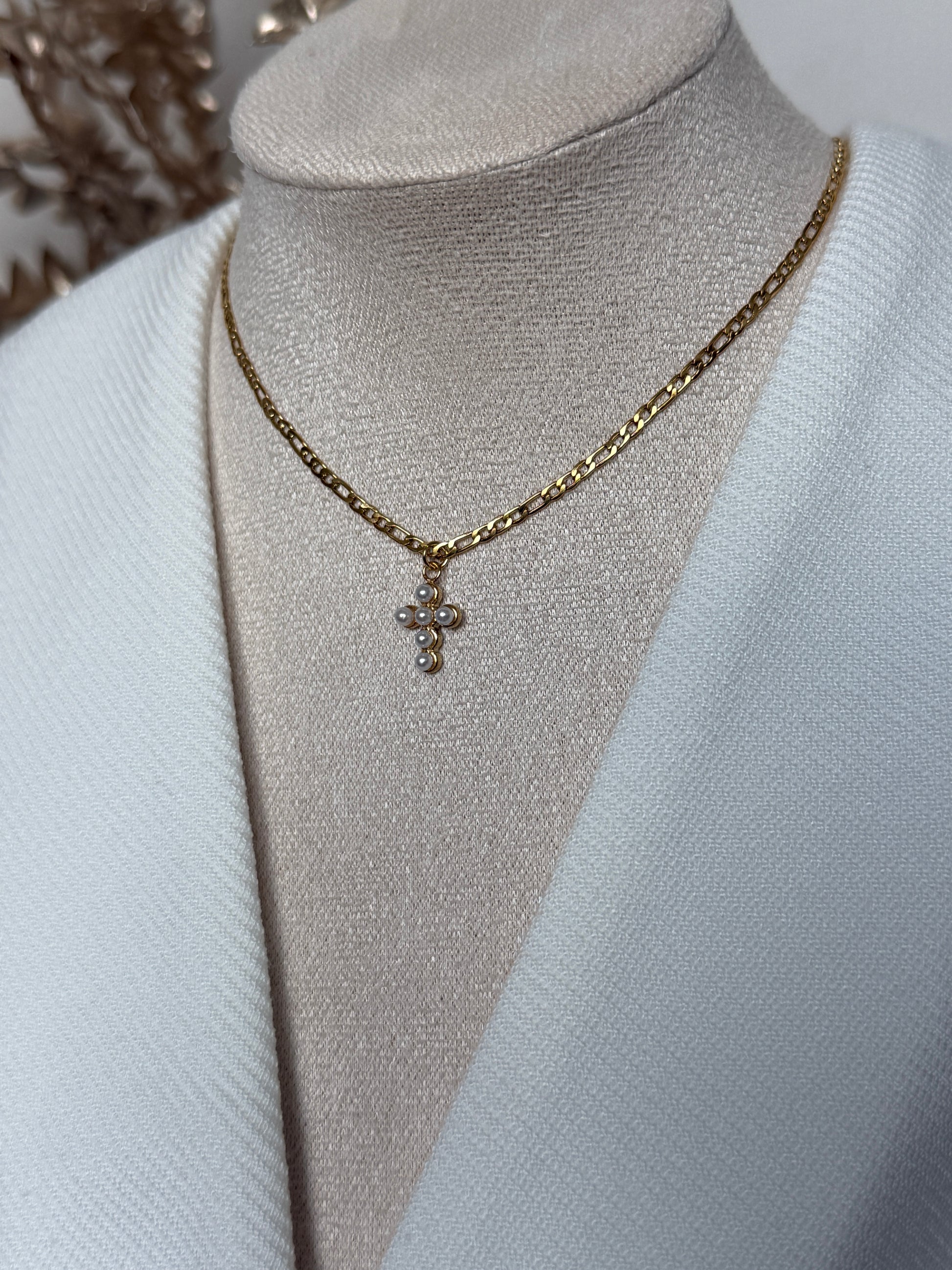 Zarte Halskette mit filigranem Kreuzanhänger, besetzt mit kleinen Perlen – elegant, zeitlos und ein stilvolles Detail für jedes Outfit.