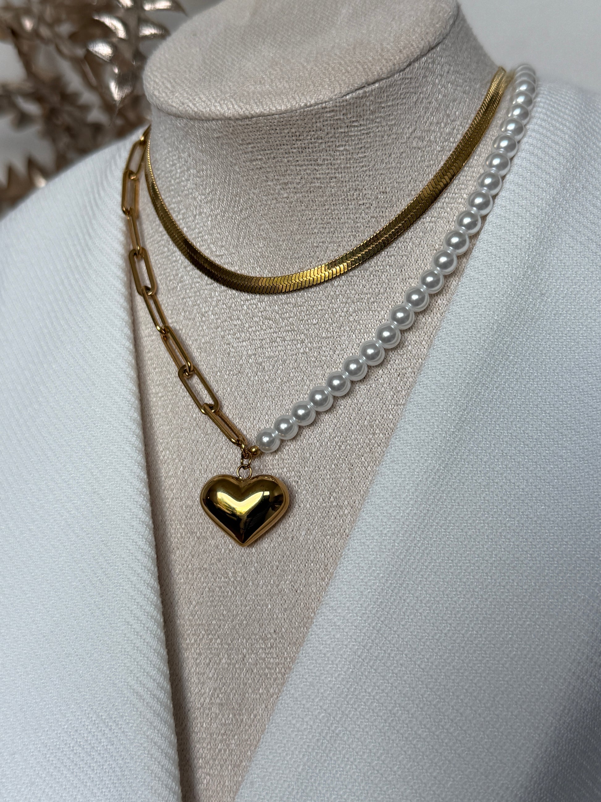 Elegante Halskette mit einer Kombination aus Perlenkette und Paperclip-Gliederung – veredelt mit einem goldenen Herzanhänger für einen modernen und femininen Look.