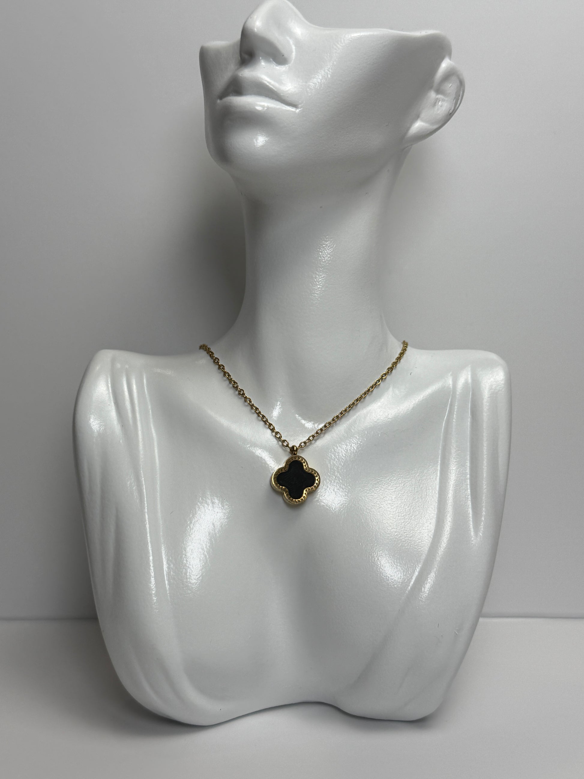 Feine Halskette mit schwarzem Clover-Anhänger aus 18K vergoldetem Edelstahl. Der Kontrast von glänzendem Gold und tiefem Schwarz verleiht ihr eine edle, zeitlose Ausstrahlung – perfekt für elegante Looks oder als dezentes Statement im Alltag.