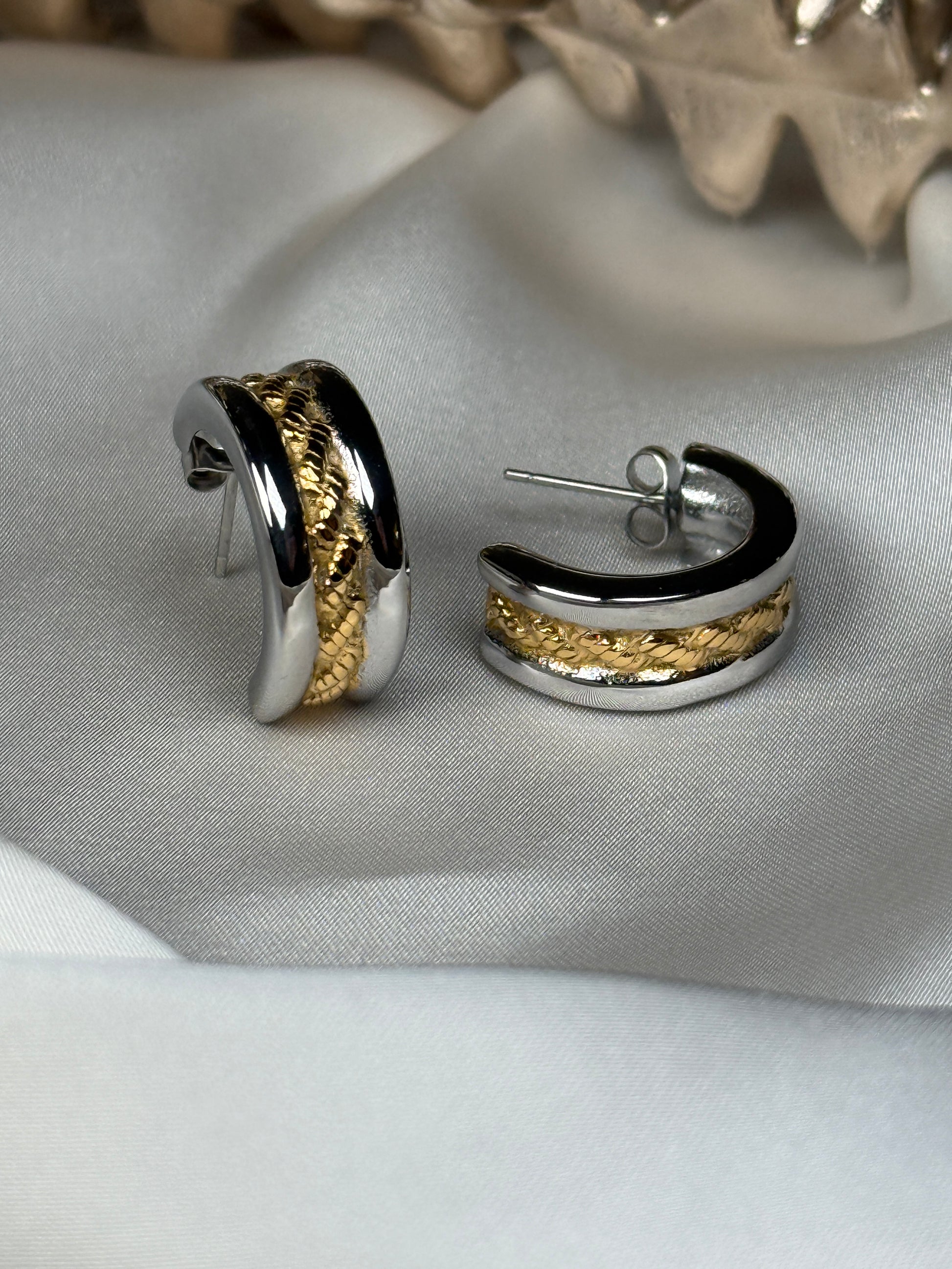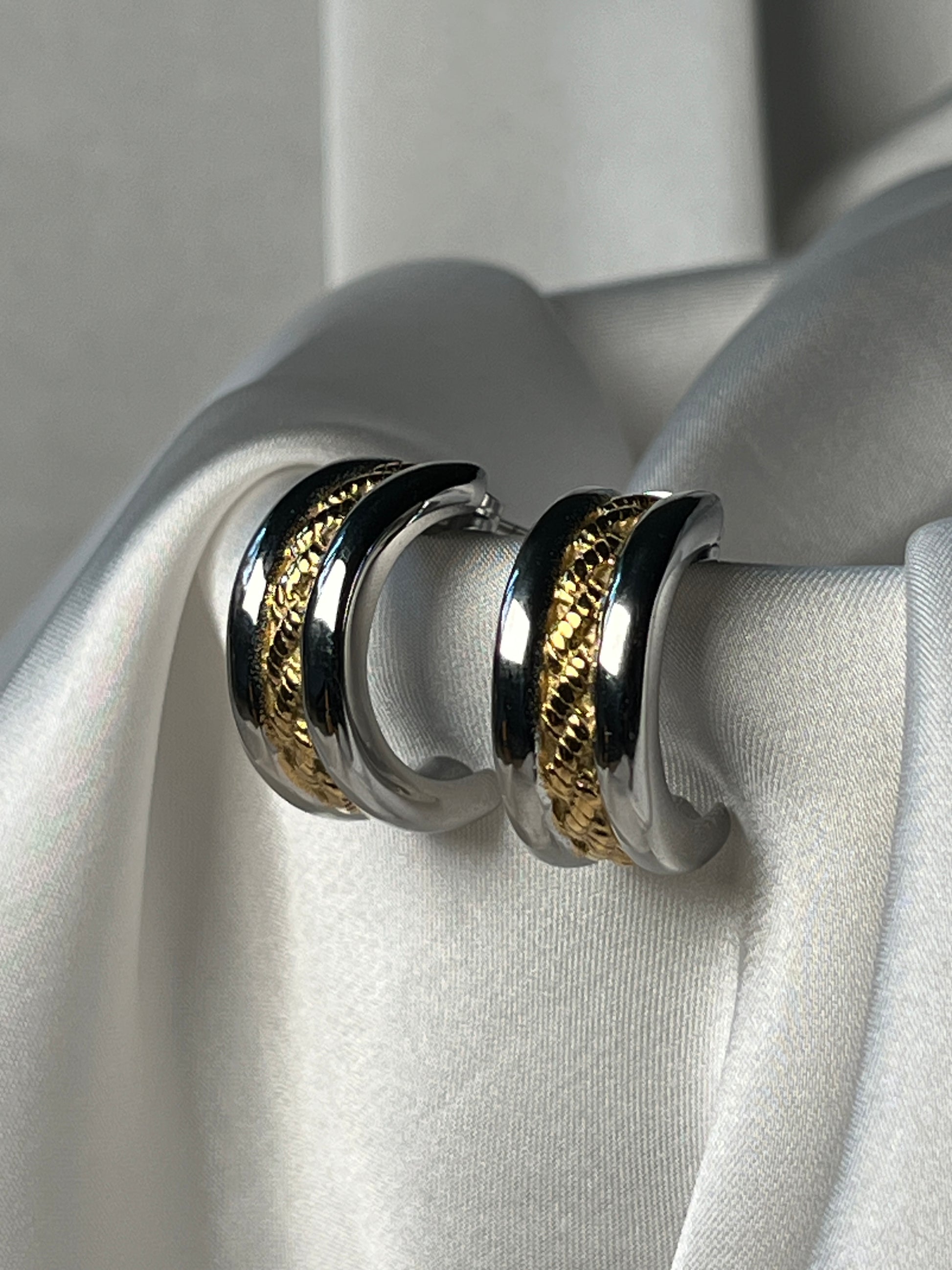 Edelstahl-Creolen in Bicolor-Optik. Silberfarbenes Finish mit goldener, strukturierter Einlage – modern, elegant und zeitlos.
