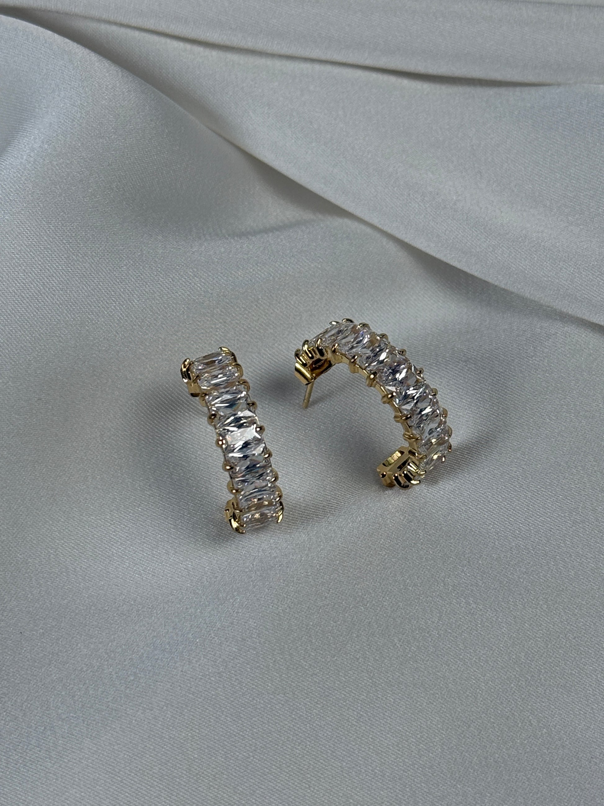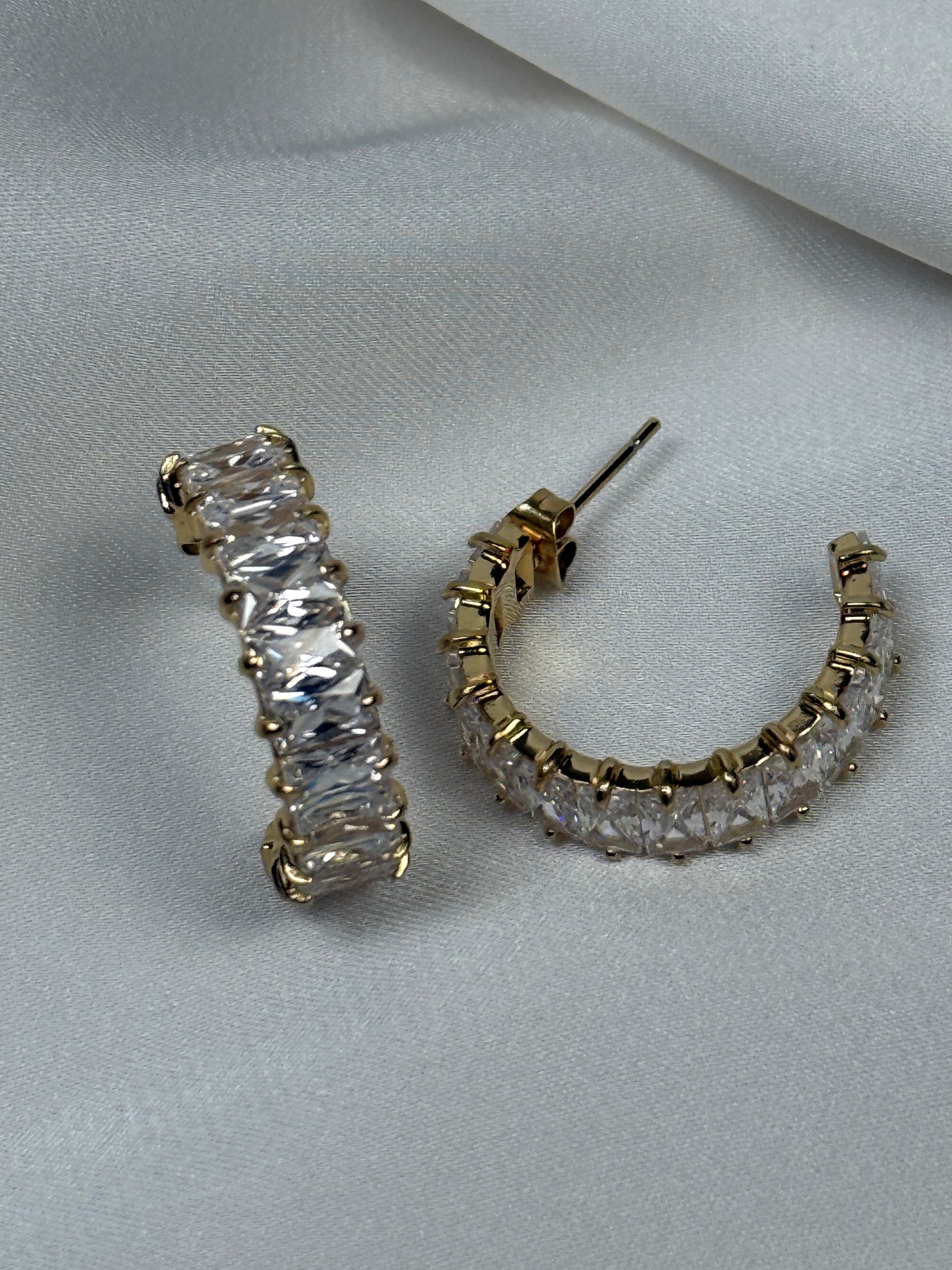 Elegante Creolen mit rechteckig geschliffenen Zirkonia-Steinen in durchgehender Fassung. Ihr klarer, luxuriöser Look macht sie zum perfekten Accessoire für Abendoutfits oder besondere Anlässe.