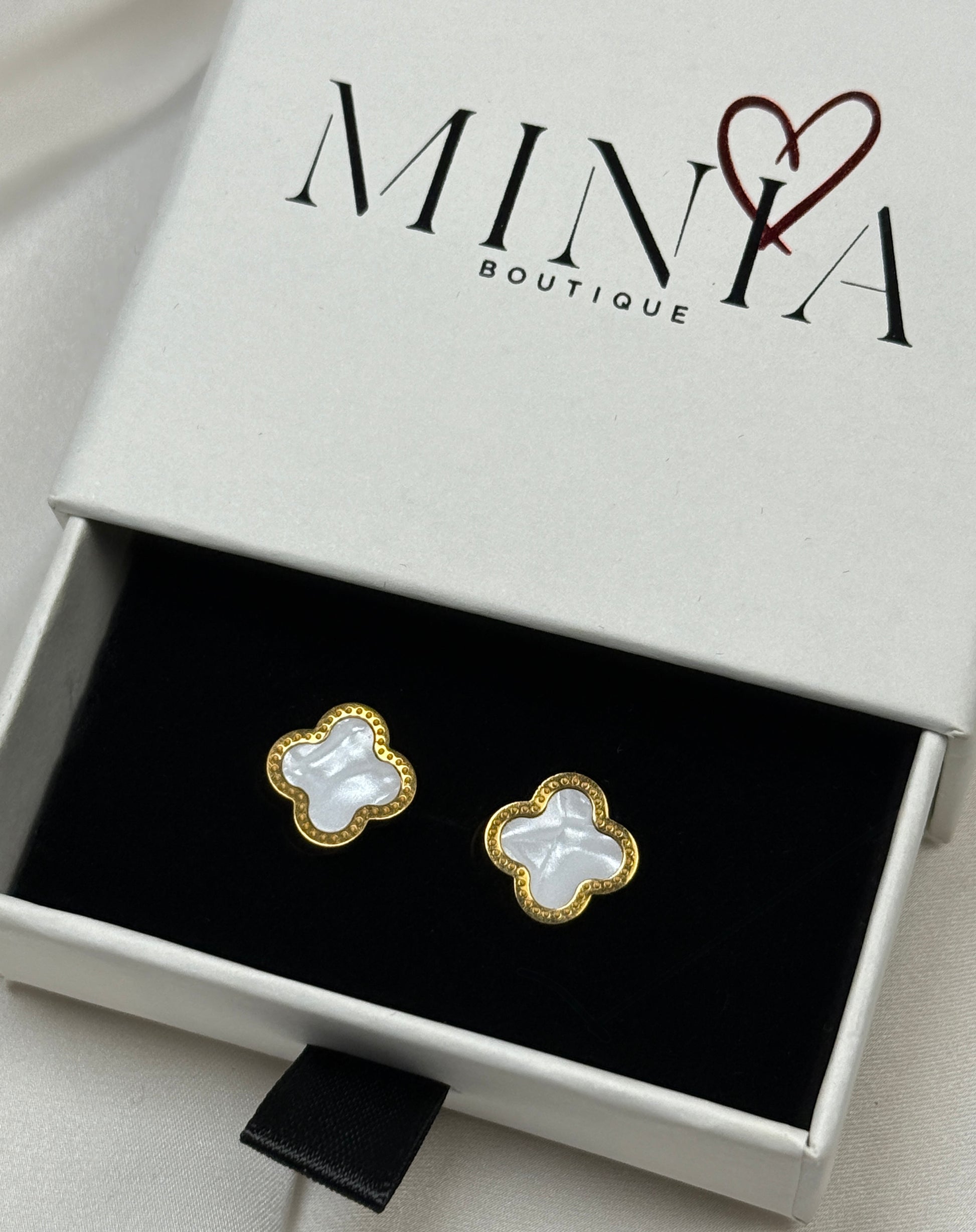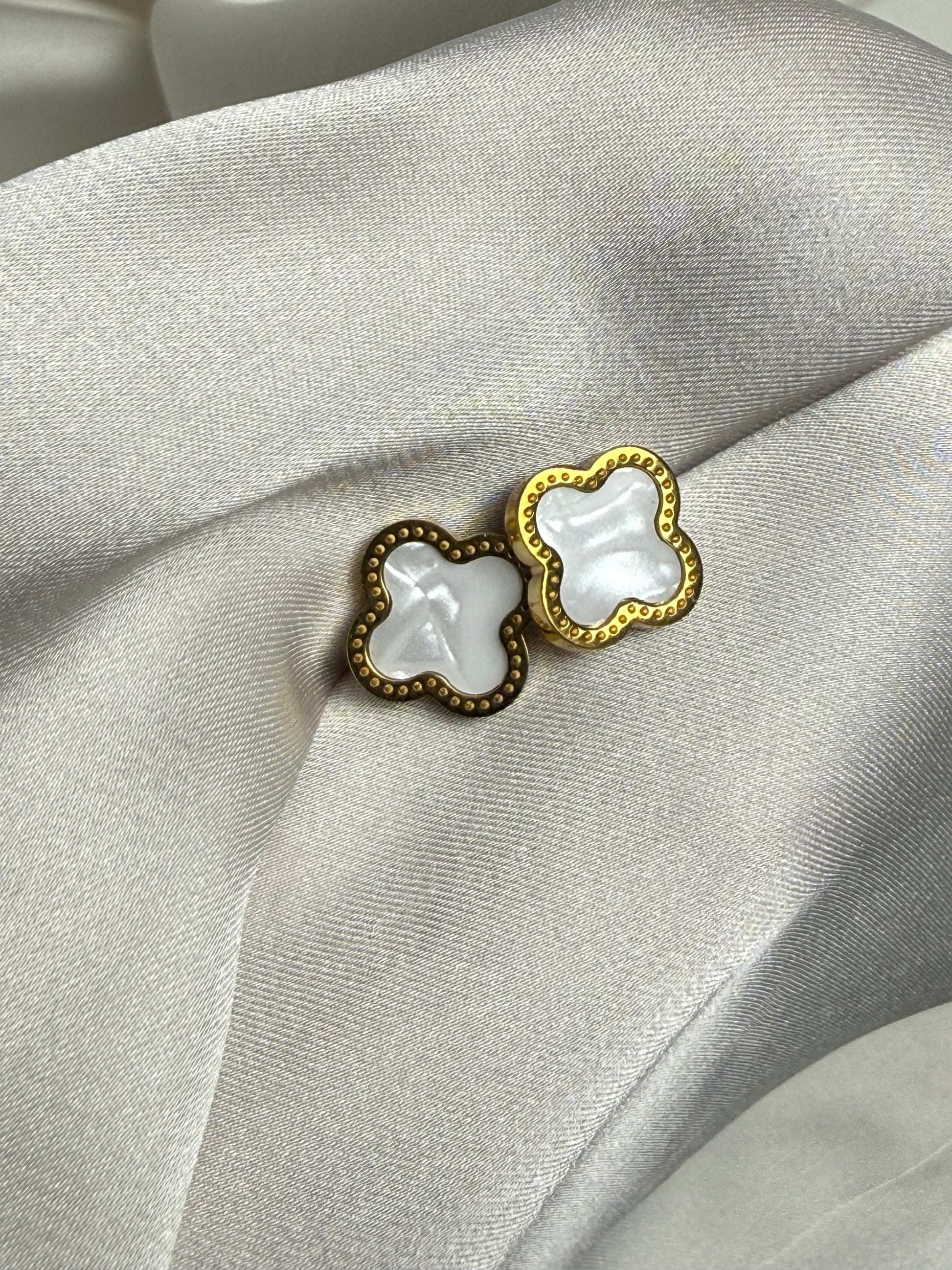 Elegante Ohrstecker im weißen Kleeblatt-Design aus vergoldetem Edelstahl. Die helle Perlmuttoptik und die goldene Fassung verleihen diesen Ohrringen eine zeitlose Eleganz – dezent, edel und vielseitig kombinierbar.