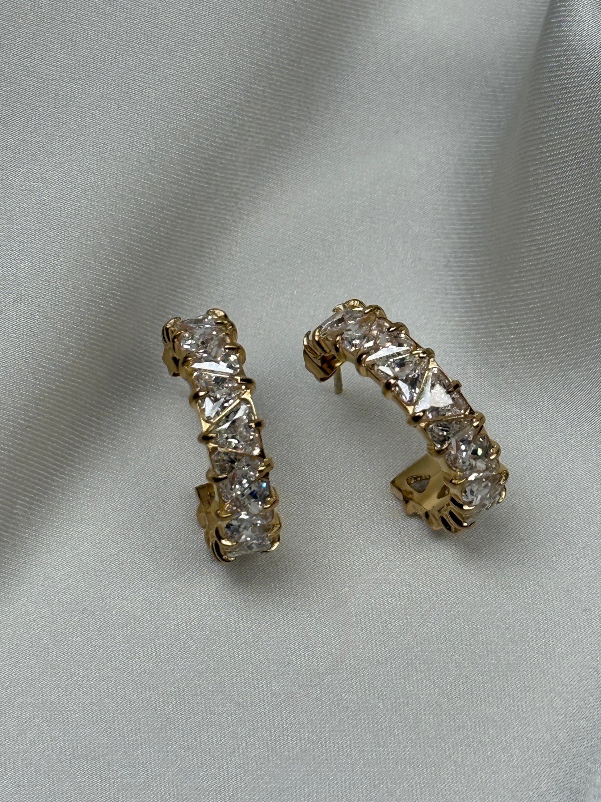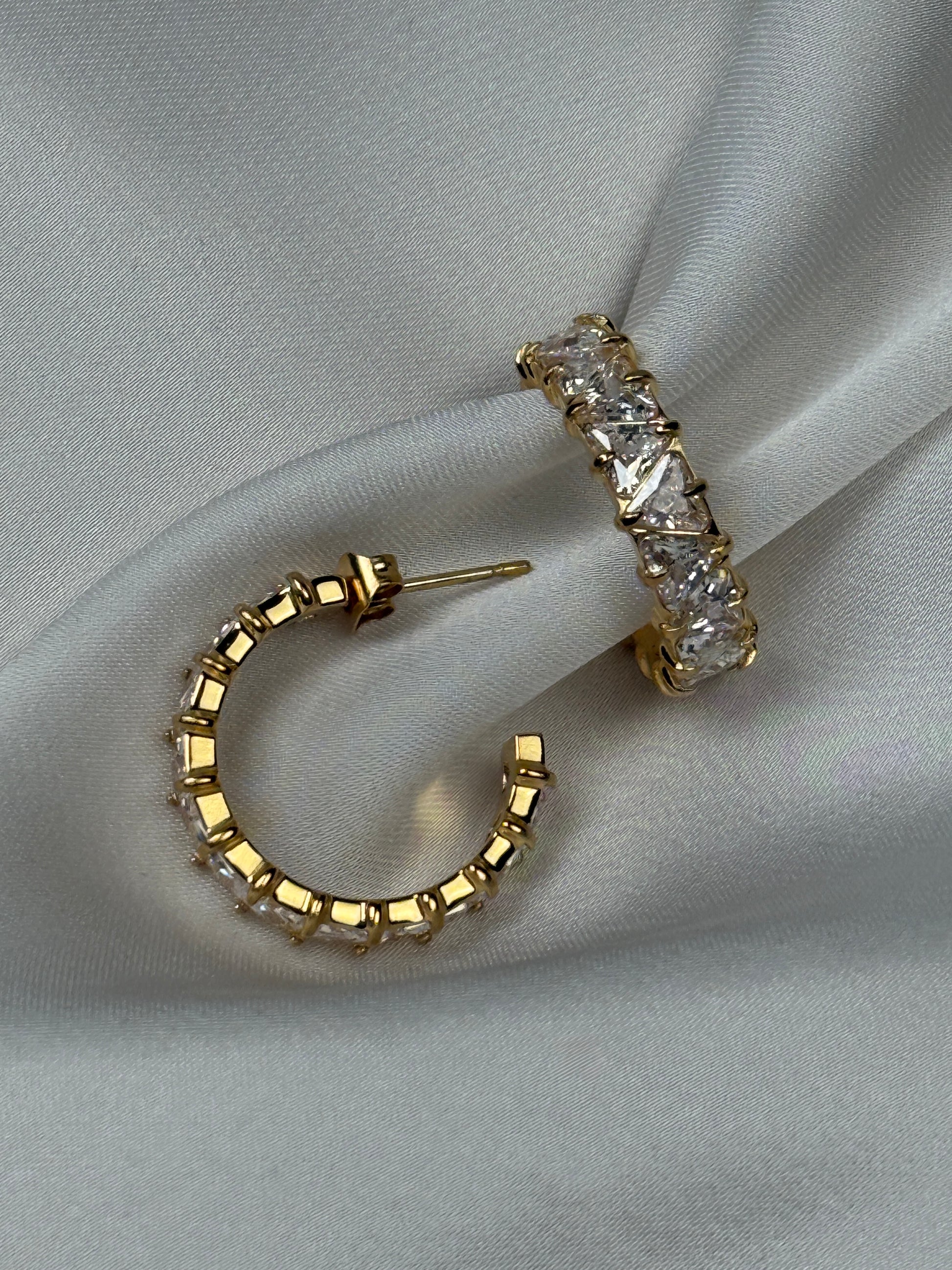 Feine Creolen mit rundum gefassten Zirkonia-Steinen in edler, vergoldeter Fassung. Der elegante Glanz und die harmonische Form machen sie zum perfekten Begleiter – von Alltag bis Abendlook.