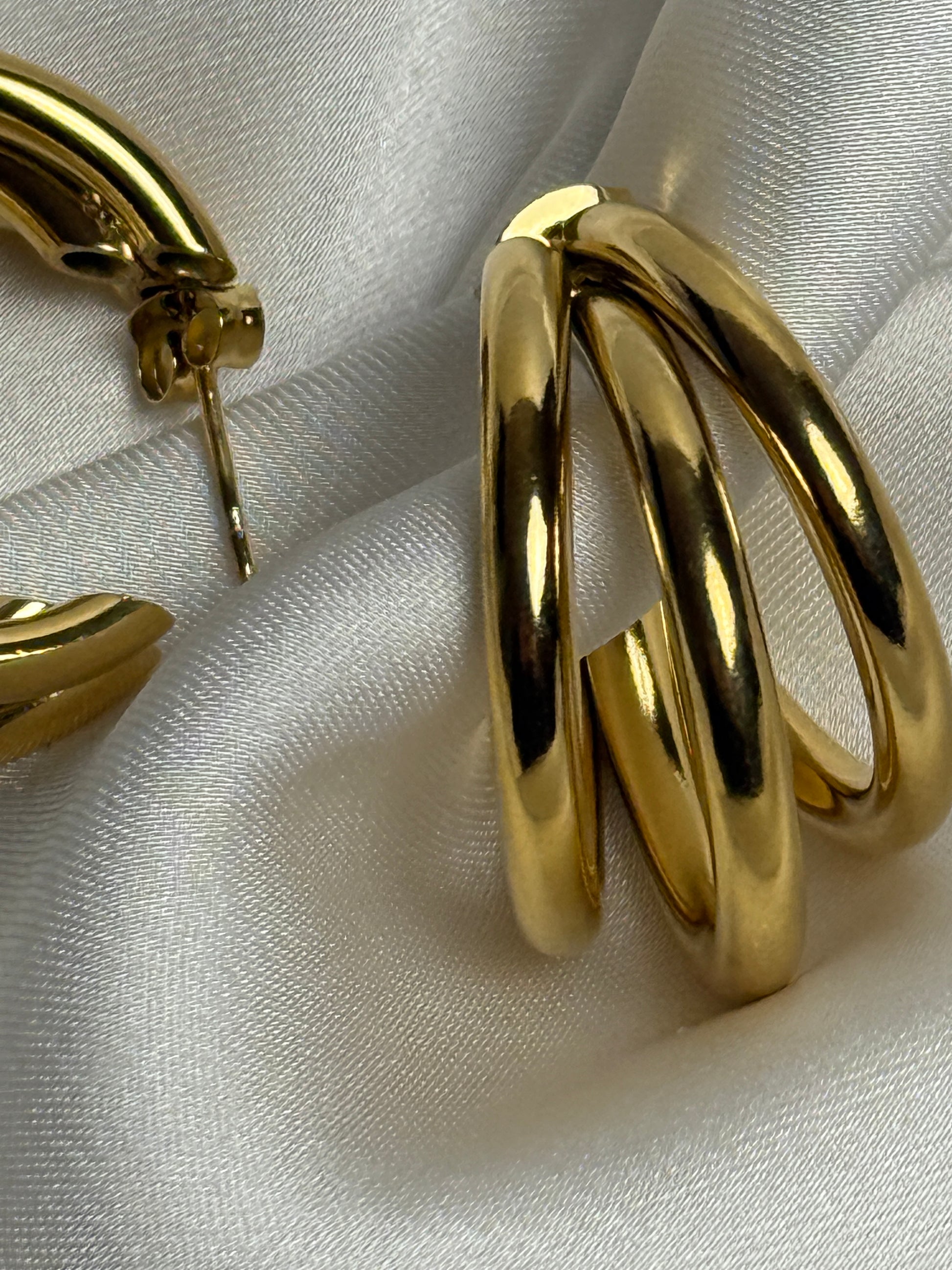 Elegante Creolen mit dreifach geschwungenem Design aus hochwertigem, 18K vergoldetem Edelstahl. Ihr voluminöser Look und der sanfte Glanz machen sie zu einem stilvollen Statement-Piece – perfekt für Tag und Abend.