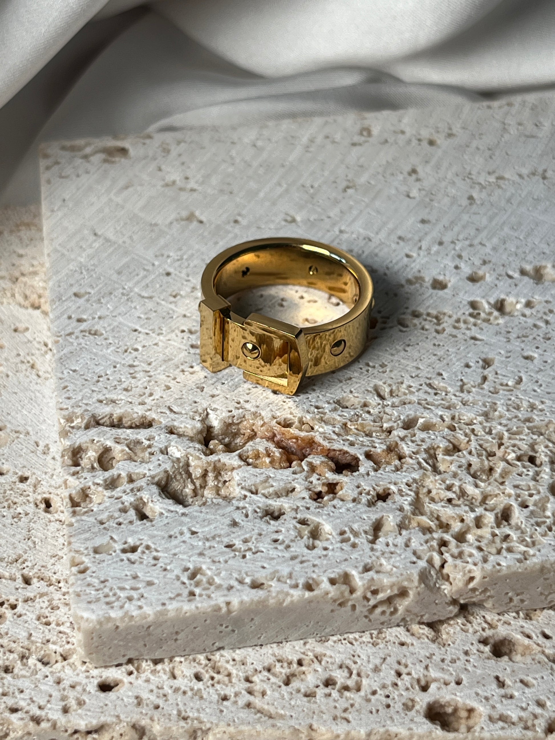 Massiver Edelstahl-Ring, 18K vergoldet, im modernen Schrauben-Design. Das breite Band mit markanten Details verleiht dem Ring eine starke, edgy Ausstrahlung – perfekt für selbstbewusste Styles.