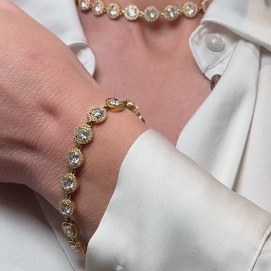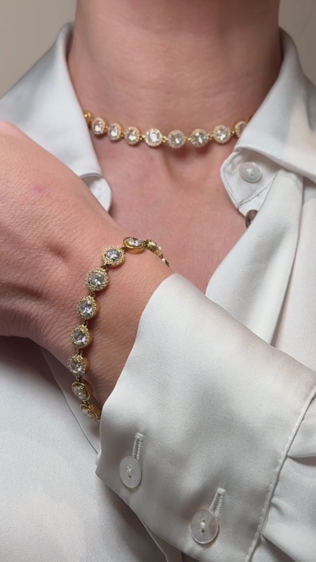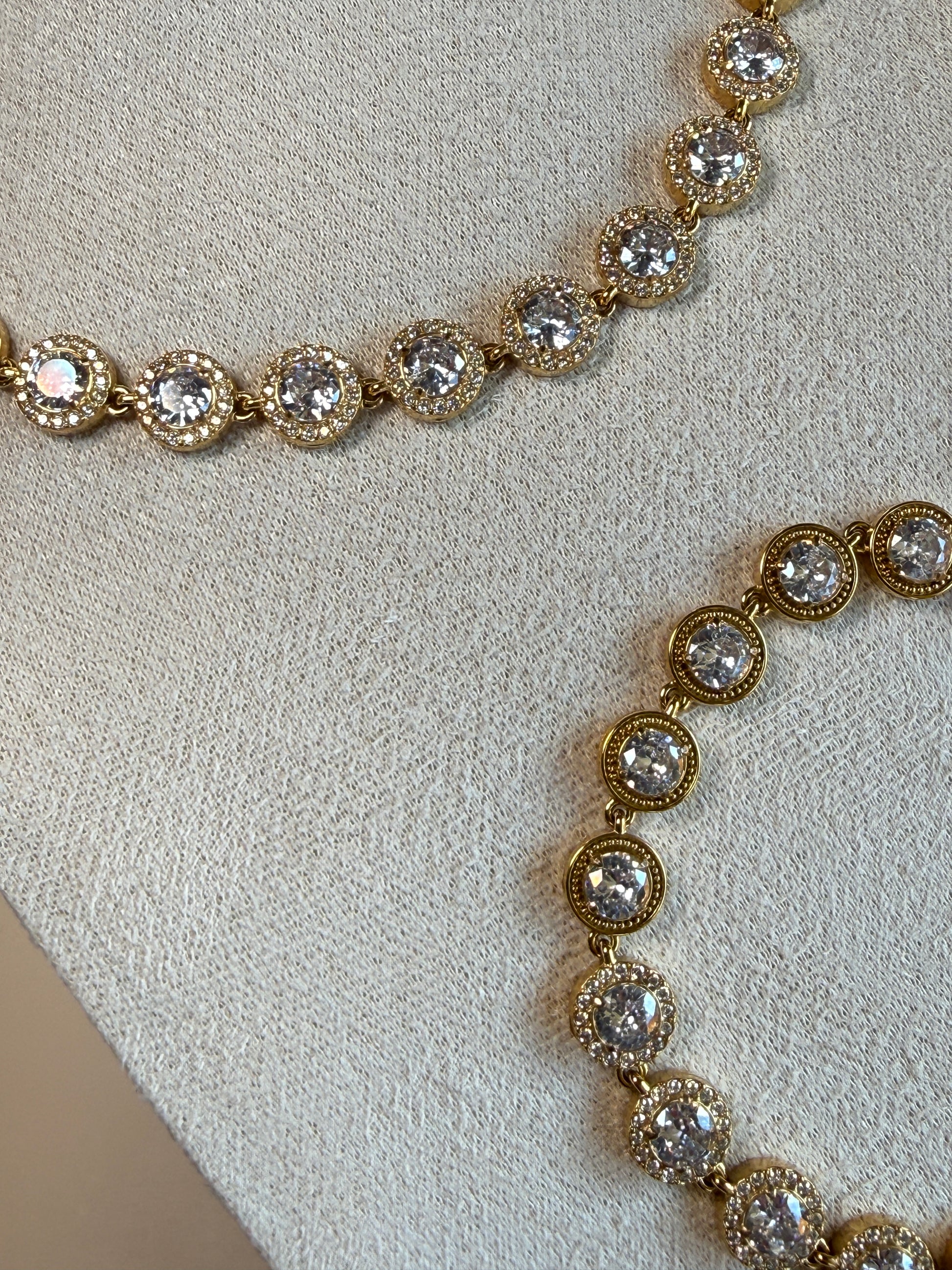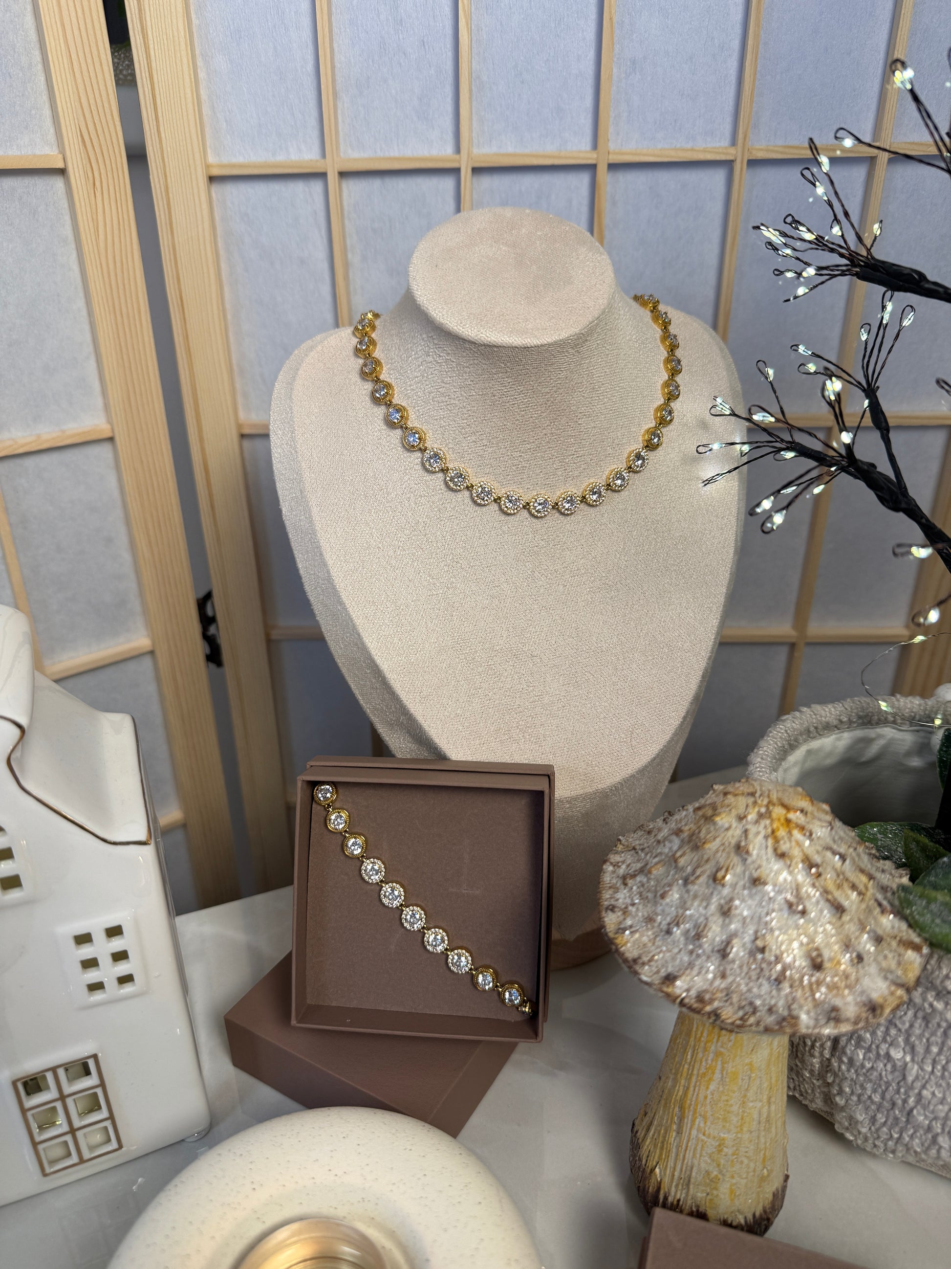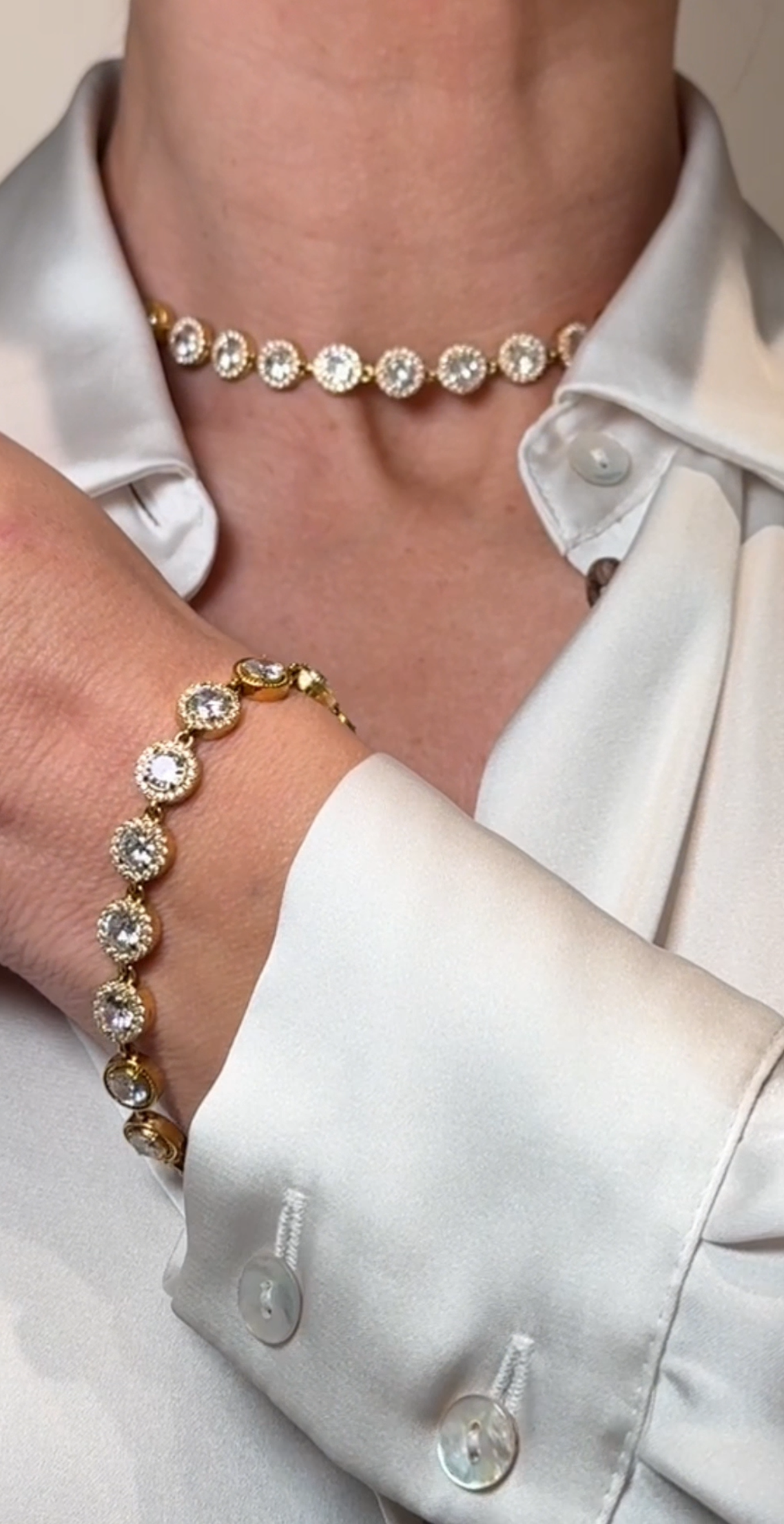 Ein zeitloses Schmuckset aus funkelnden Zirkonia-Elementen in klassischer Rundfassung. Die feinen Lichtreflexe verleihen jedem Look eine elegante Note – stilvoll im Alltag, perfekt zu besonderen Anlässen. Beide Schmuckstücke harmonieren ideal miteinander und lassen sich auch einzeln vielseitig kombinieren.